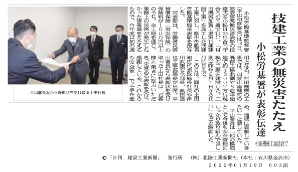 福井労働局より「(仮称)福井SCMセンター新築工事」と小松労働基準監督署より「村田機械加賀工場第11棟建設工事」のそれぞれの工事が、『建設業無災害表彰』を受けました。