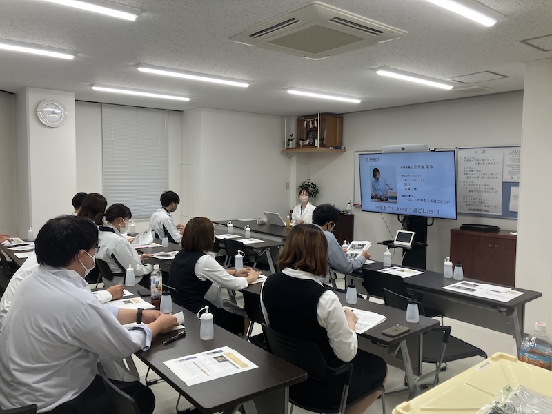 “協会けんぽ講習会”よりふくいの食育リーダーの管理栄養士の方を派遣していただき、「-おいしいと共に、ずっといきいき- ヘルシー食生活講座」を開催いたしました。講座には17名の従業員が参加しました。
