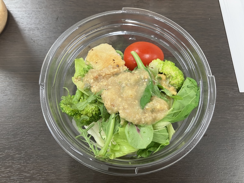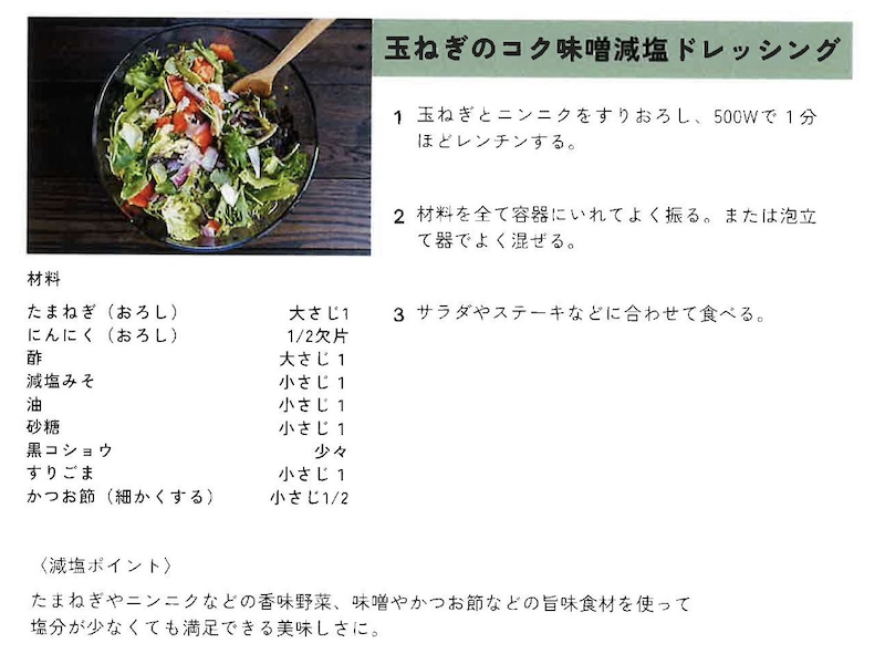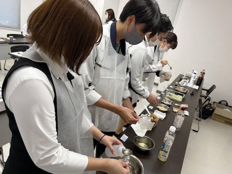 減塩ドレッシング作りでは、最初に「洋風」「中華風」の2種類を作っていただき食べ比べを行いました。その後は「玉ねぎのコク味噌減塩ドレッシング」の材料を自分で容器に入れ、サラダにかけて試食しました。家にある材料で簡単に作ることができ、参加した従業員は「おいしい!」とあっという間に完食していました。