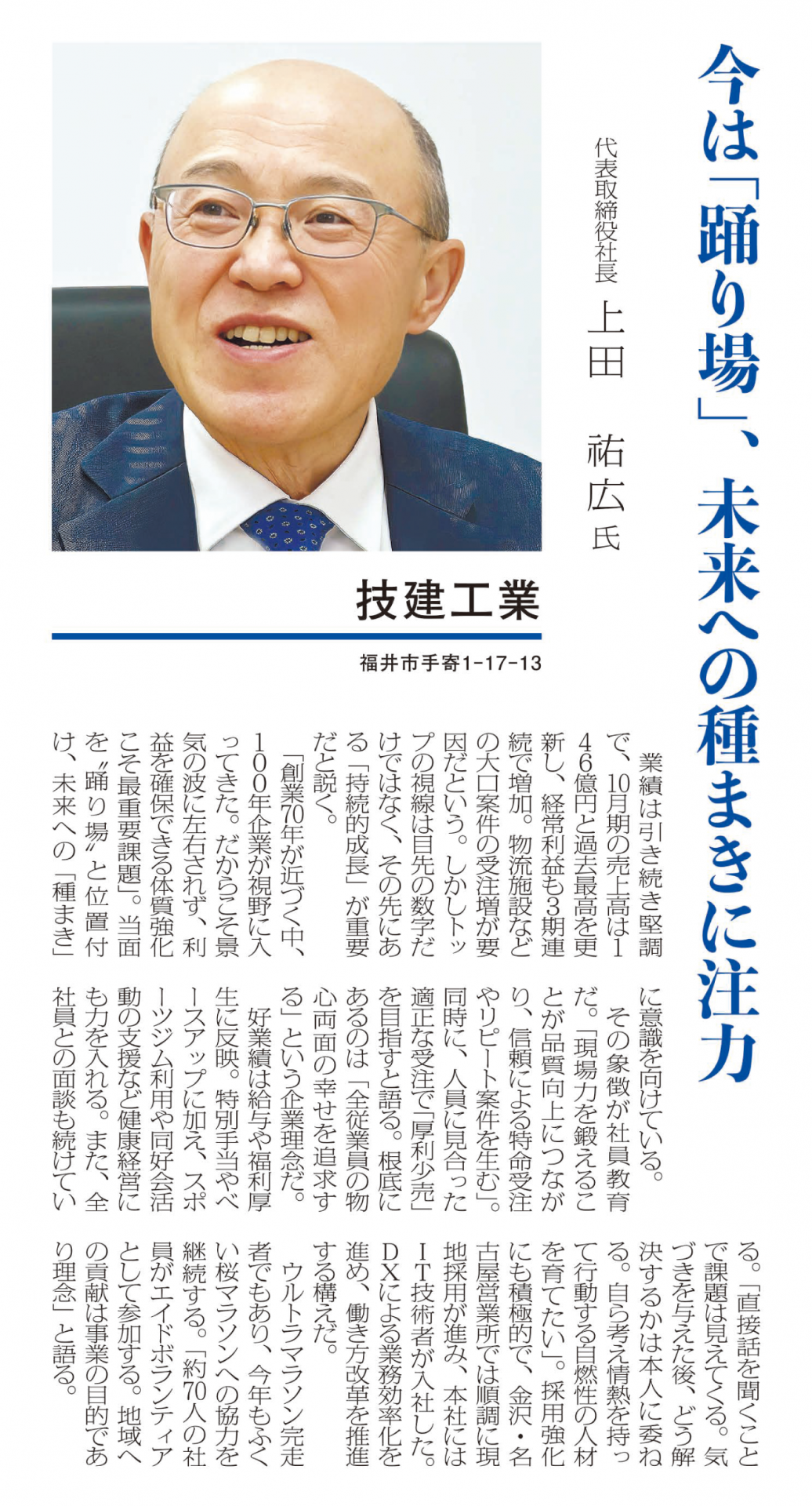 さて、今年も元日の福井新聞の「新春トップインタビュー」に、弊社代表取締役社長上田の年頭所感を掲載していただきました。