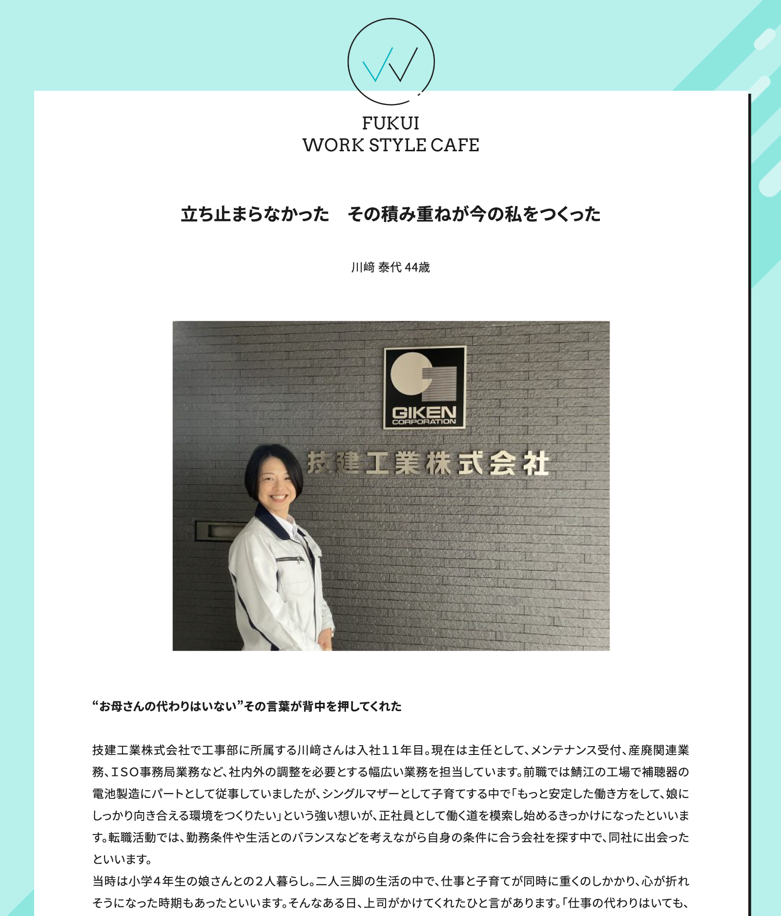 福井県の働き方改革のポータルサイト「フクリエ(Fukurea)」が運営するWEBメディア「フクイワークスタイルカフェ」に弊社工事部主任の川﨑が掲載されました。
